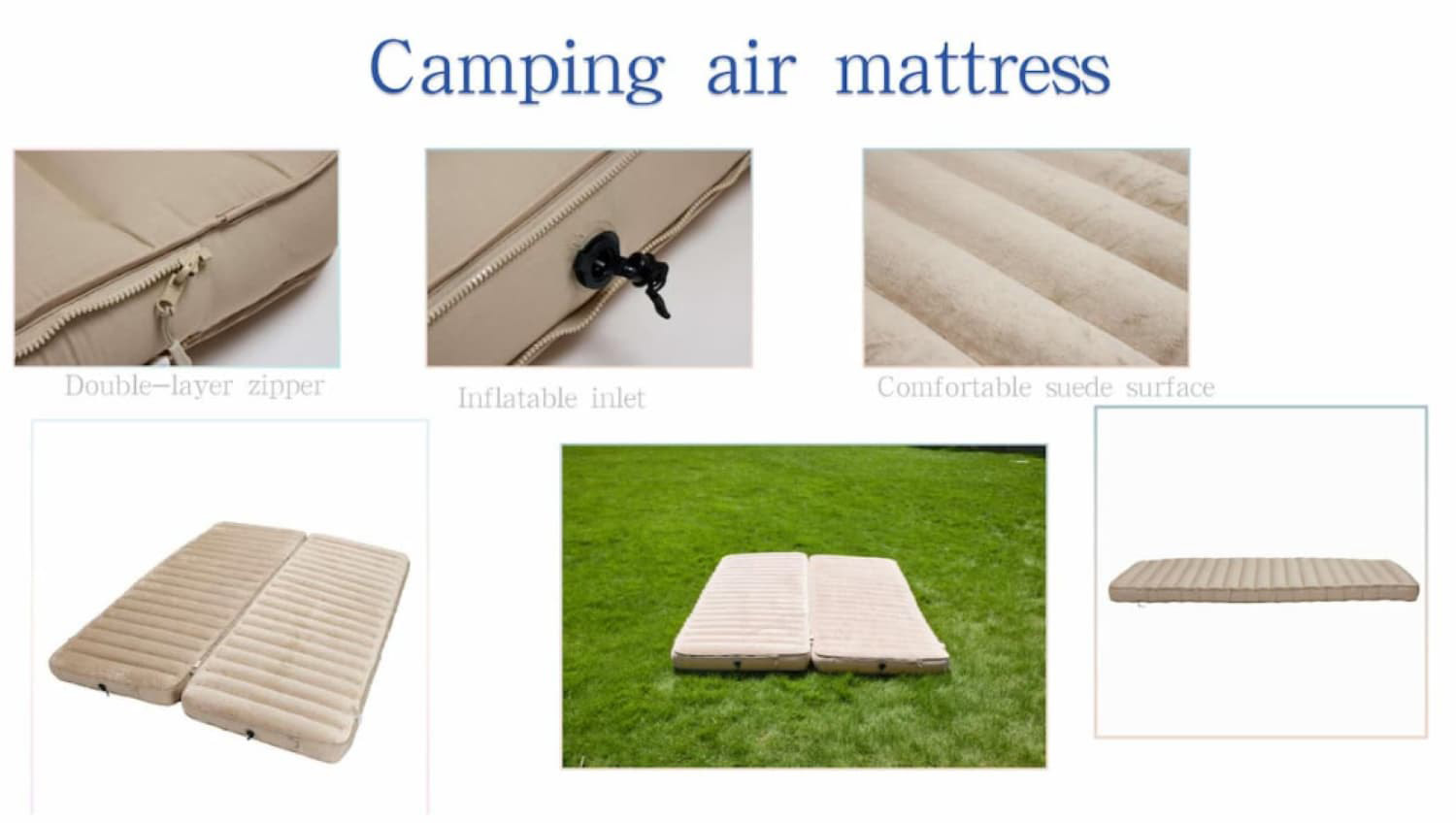 As a home-use air mattress, it features a double-layer zipper for added durability and convenience—ideal for frequent home use. There is an inflatable inlet, which makes inflating the mattress easy, even for quick setup when guests arrive. The surface is made of comfortable suede, providing a soft touch that suits daily leisure or overnight stays. The mattress can be used in a split form (for kids’ play areas or single use) or combined into a larger one (for couples or guests), suitable for different home needs, and it can also be laid flat as a single mattress for temporary bedding or balcony relaxation.
